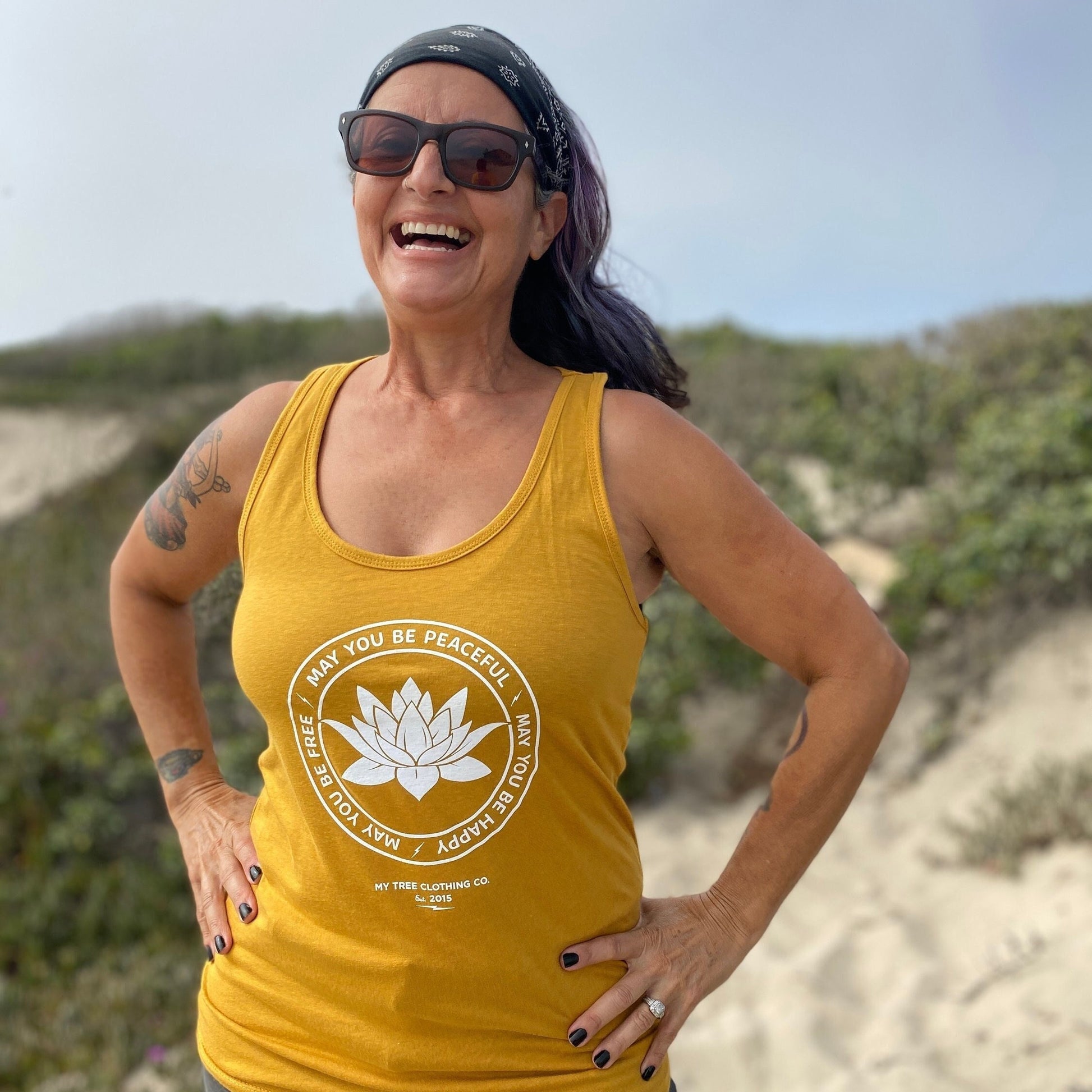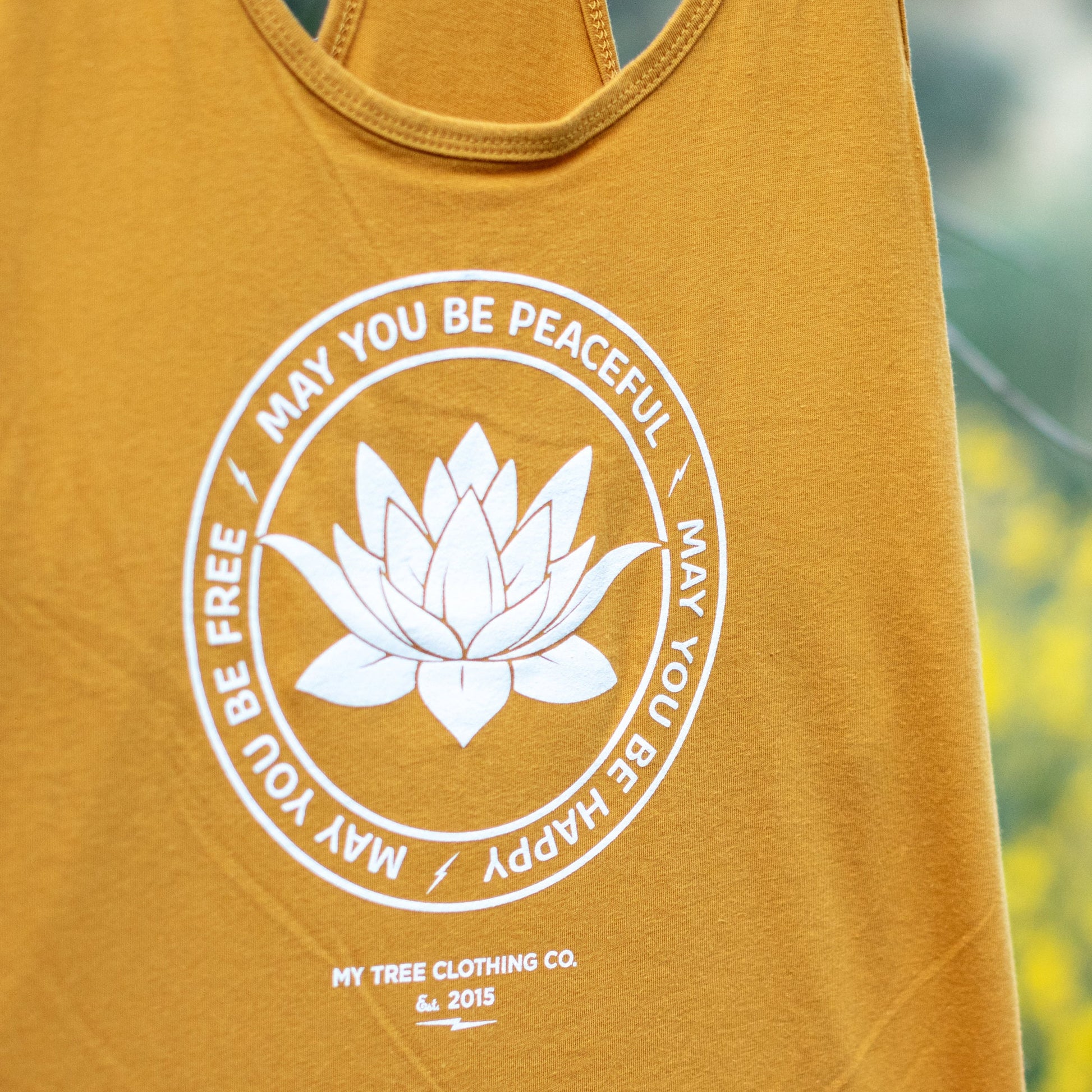 Share the message of loving kindness (Mettā) with this soft and fitted racerback tank top featuring the words: "May You Be Peaceful – May You Be Happy – May You Be Free", paired with a white lotus design on antique gold fabric.