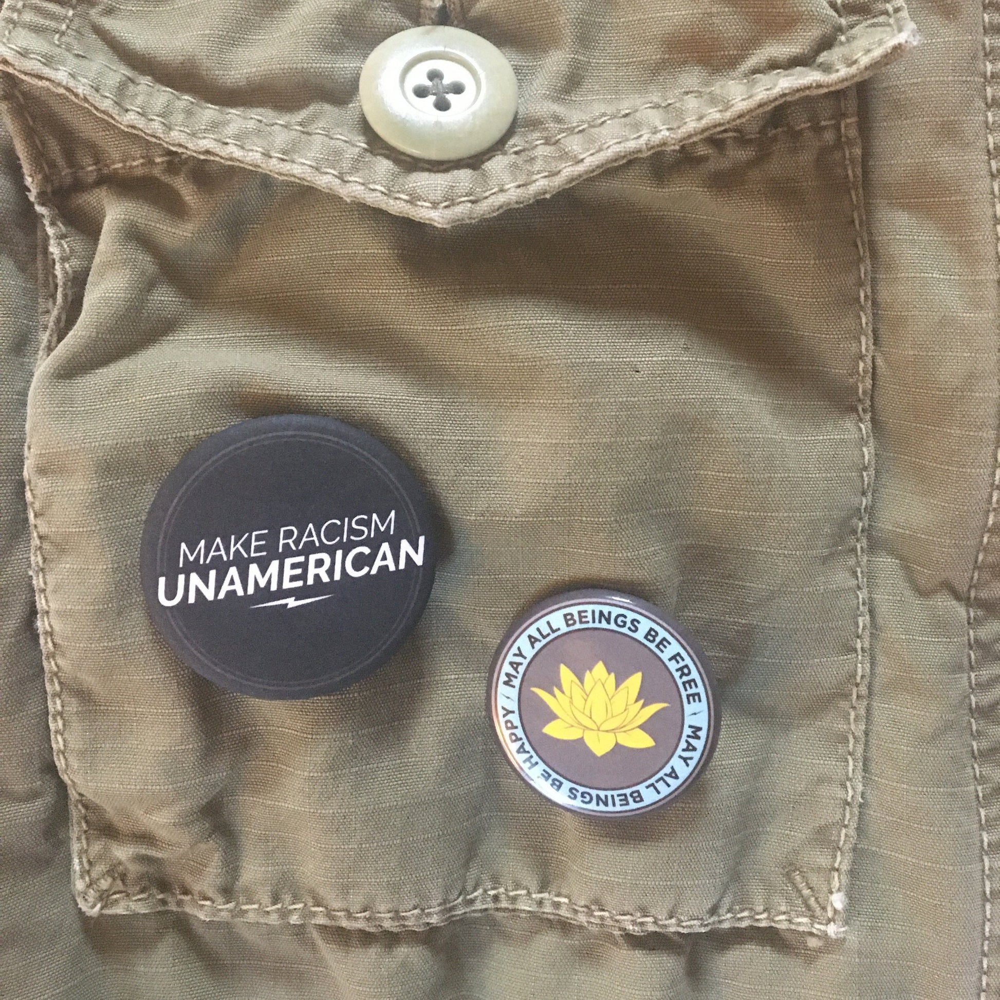 Share the message of Loving Kindness (Mettā) with this 1.25" pinback button featuring a delicate lotus design and the words “May All Beings Be Happy” and “May All Beings Be Free.” This small yet powerful accessory is perfect for backpacks, jackets, hats, or reusable bags.